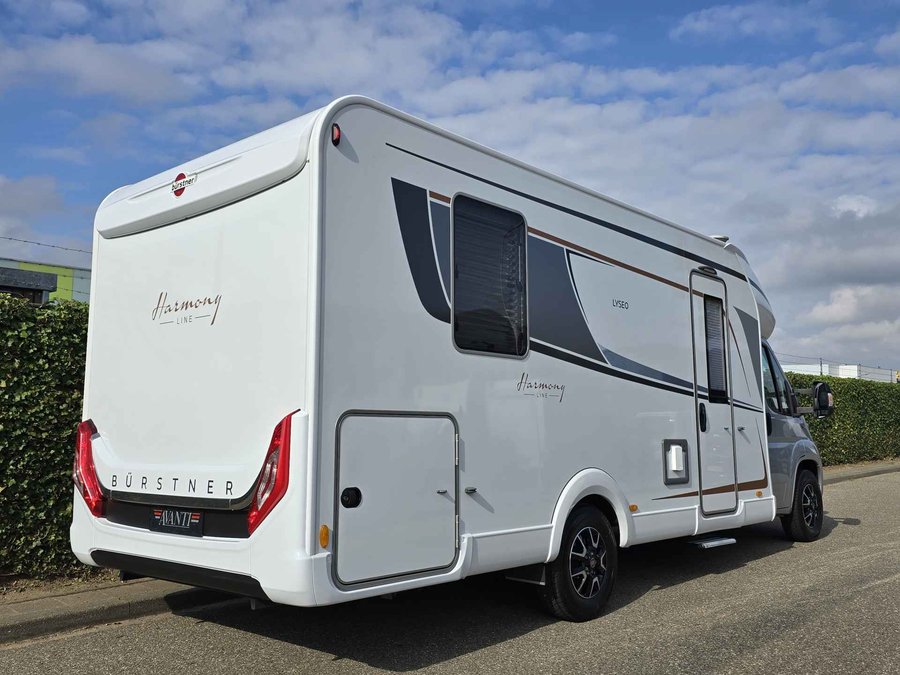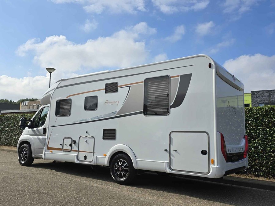 Van eerste eigenaar, in nieuwstaat verkerende, 2 persoons met 4 zitplaatsen, half-integraal camper Bürster TD 745 Harmony Line op Fiat Ducato basis met een sterke 2.3 l 140 pk dieselmotor, Euro 6, handgeschakeld, kleur wit, bouwjaar 03-05-2021 met slechts 27.689 km.