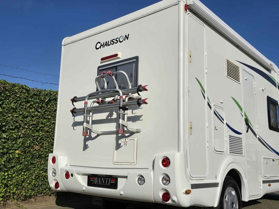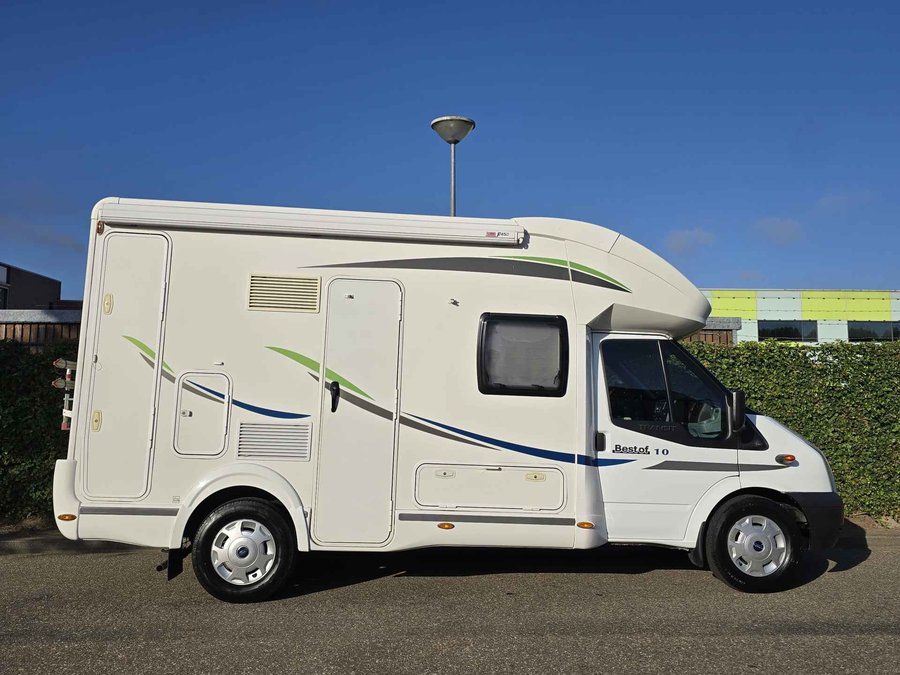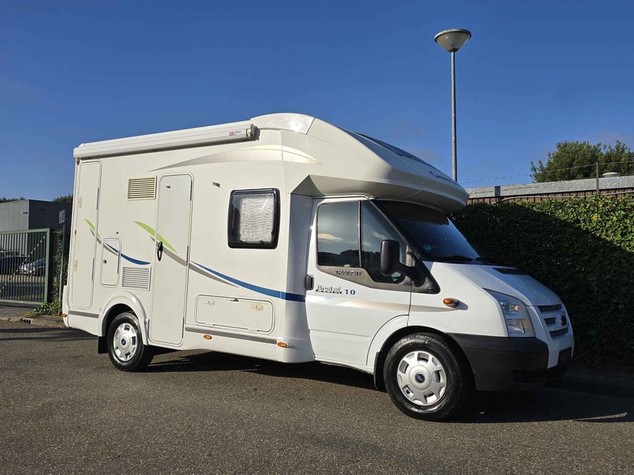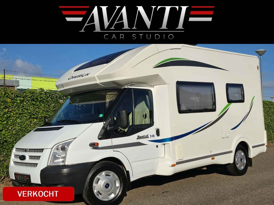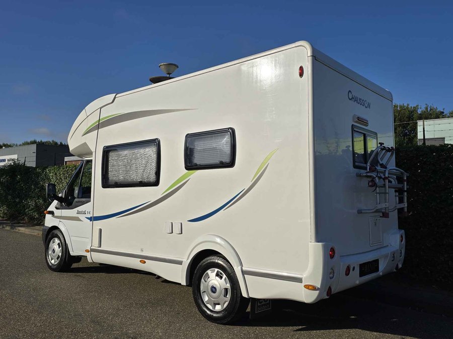 Van eerste eigenaar, in zeer goede staat verkerende, 4 persoons, half-integraal camper Chausson Best of 10 op Ford Transit basis met een sterke 2.2 l 140 pk dieselmotor, Euro 5, handmatige versnellingsbak, kleur wit, bouwjaar 02-2014 met slechts 98.817 km.