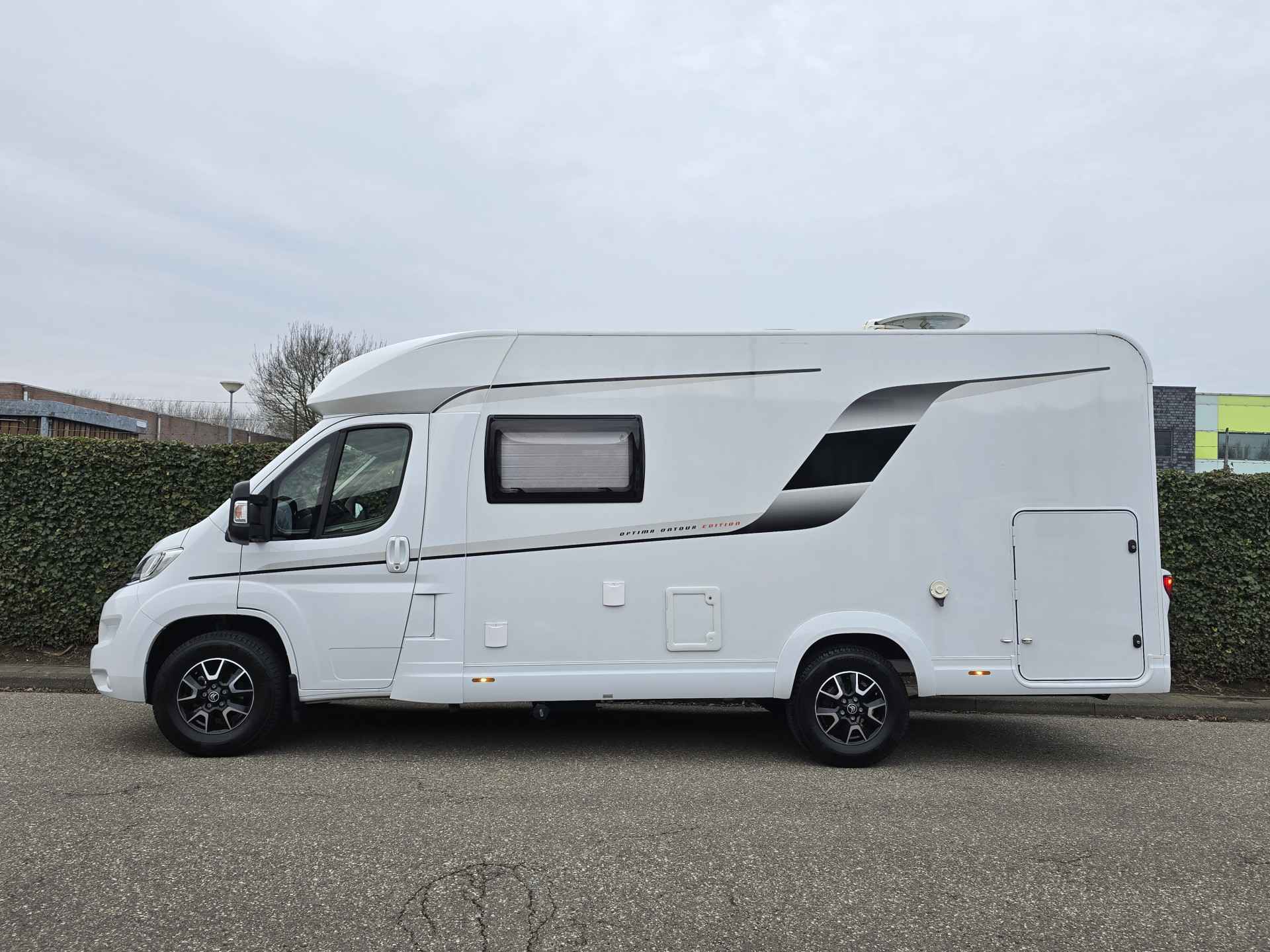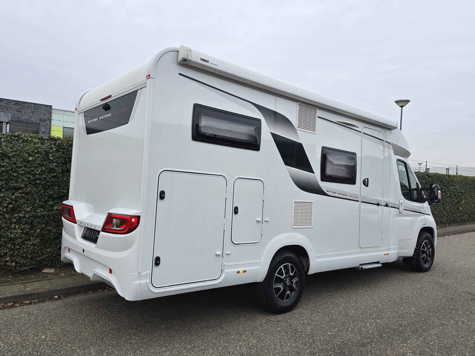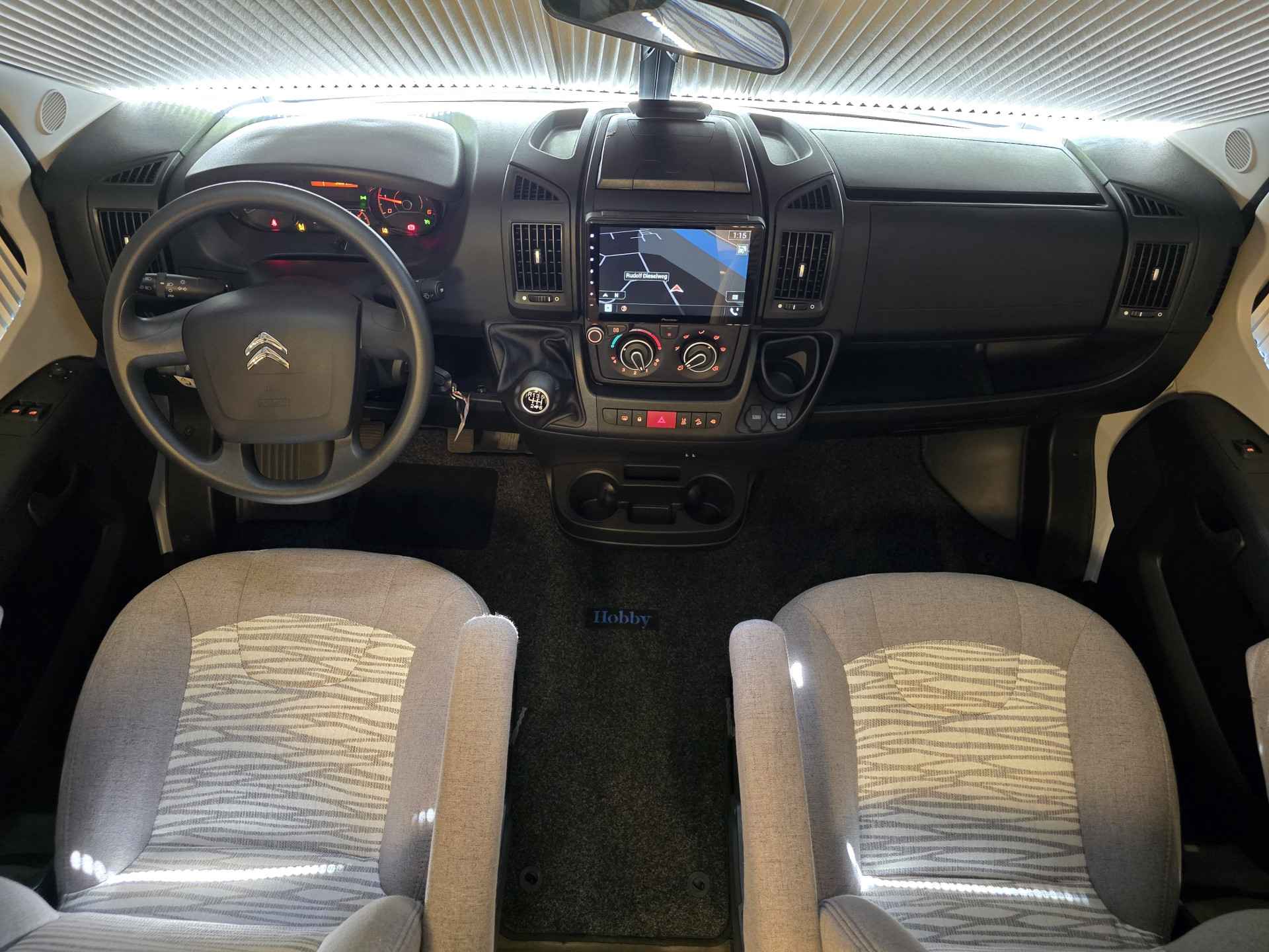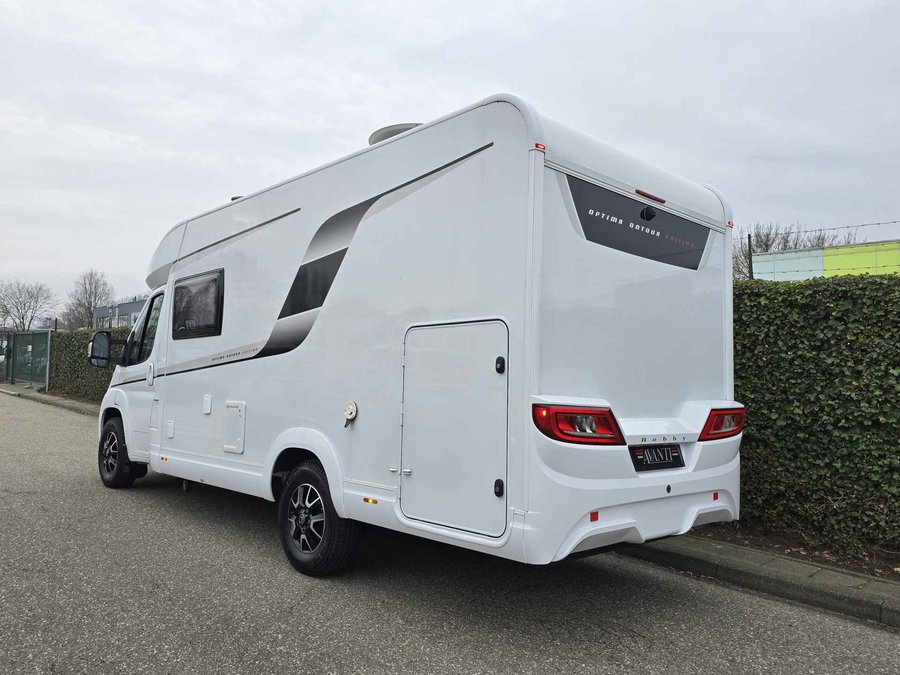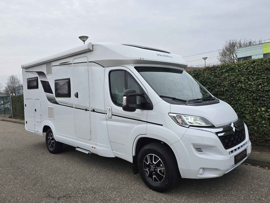 Van eerste eigenaar, in nieuwstaat verkerende, 4 persoons, half-integraal camper Hobby Optima Ontour Edition V65 GE op Citroën Jumper basis met een sterke 2.2 l 140 pk dieselmotor, Euro 6 AR, handmatige versnellingsbak, kleur wit, bouwjaar 21-09-2022 met slechts 16.839 km.