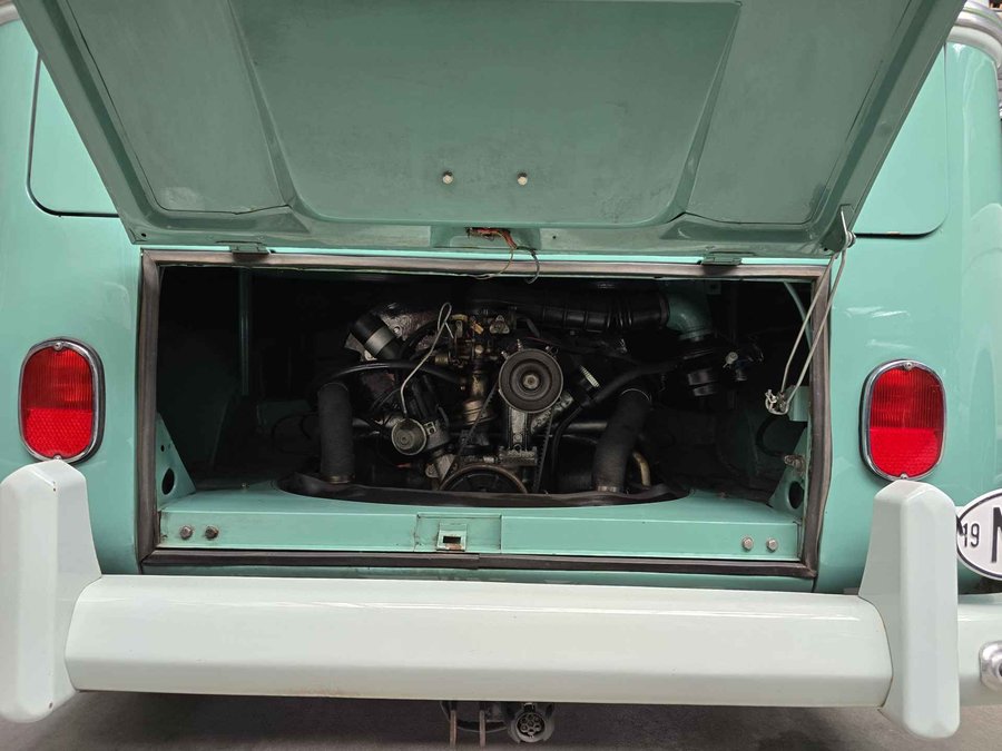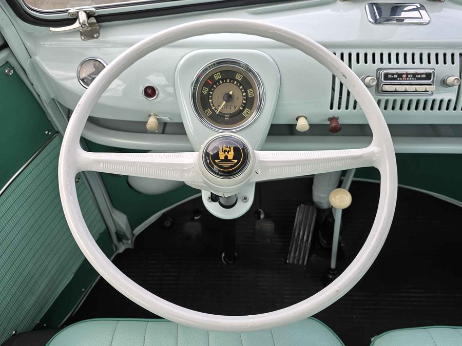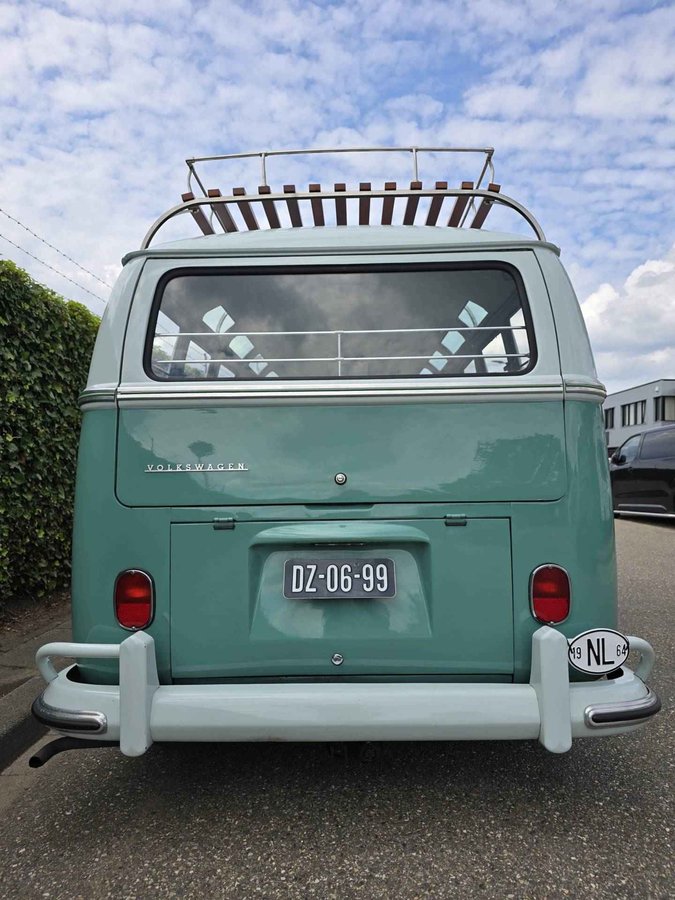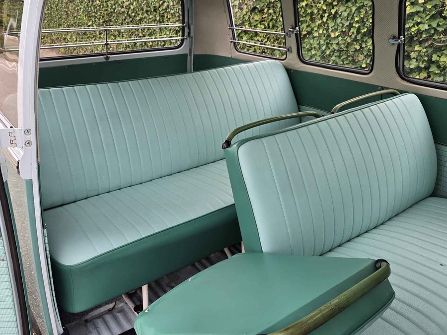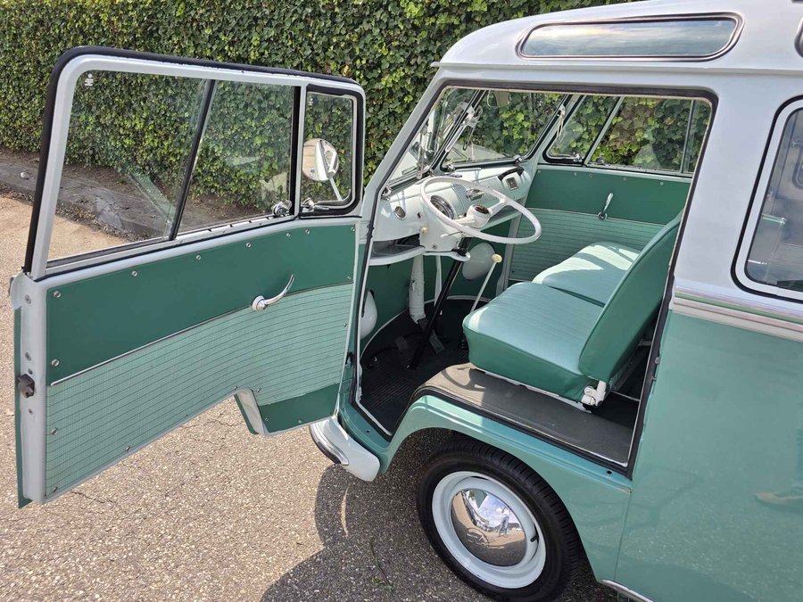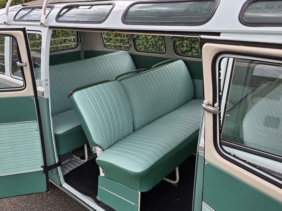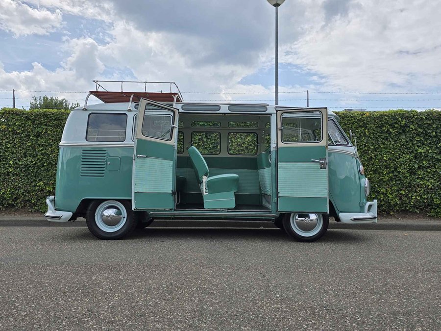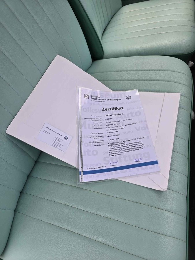 Deze originele Samba bus werd in Duitsland gebouwd en heeft een echtheidscertificaat van het Duitse Stiftung AutoMuseum Volkswagen. De Samba is de meest luxueuze uitvoering van deze iconische bus en is voorzien van groot open panorama dak met canvas vouwdak, roofrack, openslaande voorruiten. Door zijn two tone lak in Wit met Turquoise en bekleding in Como Green een echte eye-catcher. Verder is hij voorzien van een afneembare trekhaak, stalen velgen met chrome VW wieldoppen en nog veel meer !!